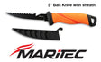MA135 - The Maritec 5?Bait Knife is crafted from top-quality stainless steel. It is Teflon coated to prevent corrosion. With its non-slip rubber handle and super sharp blade, cutting and dicing bait becomes quick and effortless. Additionally, the serrated scraper is perfect for removing scales. For safety and convenience, the knife can be stored in the thumb-lock quick clean sheath. MA136 7?MA137 9?- These fillet knives are crafted from high-quality stainless steel, Teflon coated to prevent corrosion and flesh sticking to the blade. Its curved blade and non-slip rubber handle ensure precise filleting with minimal flesh wastage. With a balanced design and quick clean locking sheath, this knife offers secure storage and easy handling. Its vibrant Hi-Vis colour enhances visibility, while the durable construction guarantees long-lasting performance in filleting tasks. MA138 - The Maritec 5?Folding Fillet Knife is corrosion-resistant with a foldable design for safe storage and easy transportation. The locking mechanism ensures a secure open position, while the non-slip rubber handle provides a safe and comfortable grip. Experience practicality, durability, and versatility in one compact tool.